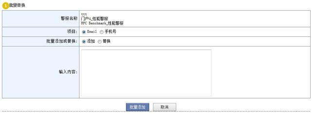 批量添加或替换:两单选项;选择添加,则会将输入的内容添加到所选的警报中;选择替换,则会有两个输入框(原内容,替换为),会在指定的警报邮件或手机号中查找原内容中的输入内容,并替换为替换为输入的内容。。
