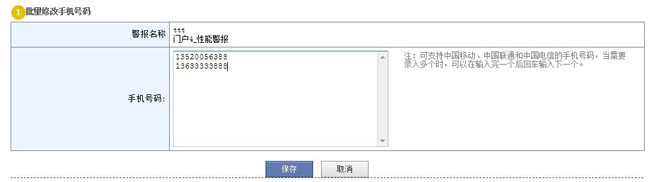 接收Email:会显示所有选中警报内的手机号码,如果不同警报中的手机号码不相同,会合并在一起,以提供修改,保存后会将所选警报的手机号码用修改后的内容覆盖。