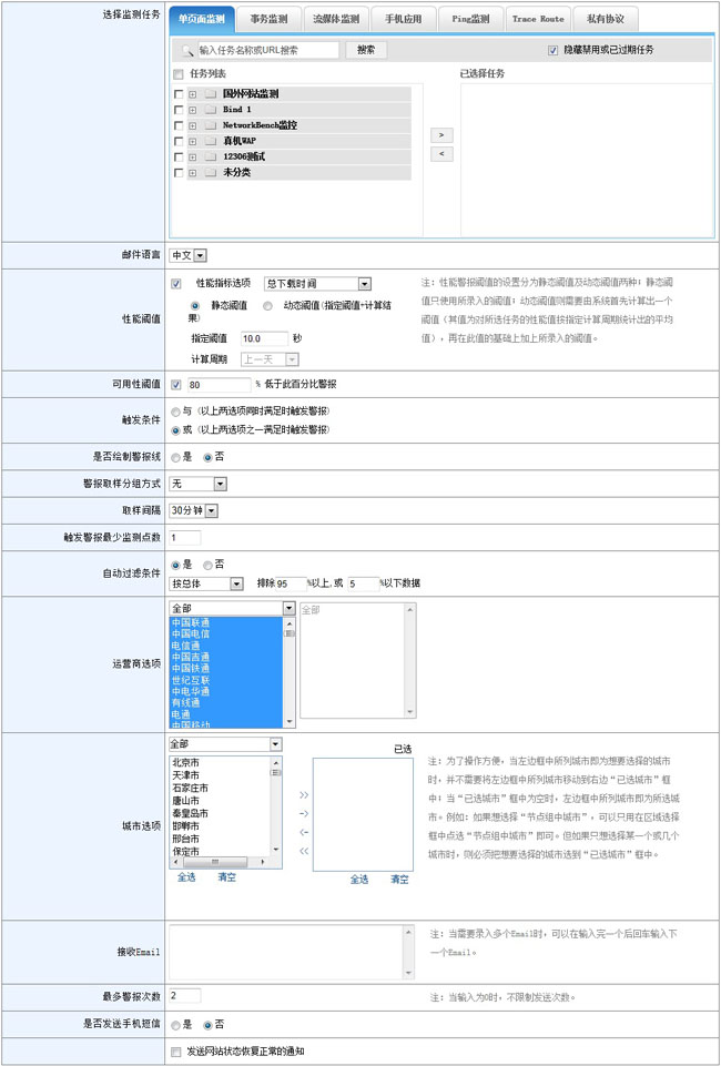 用户通过警报设置可在监测任务发生异常时及时得到通知;分为性能警报及错误警报,警报发送的方式有Email通知及手机短信通知;系统处理警报的时间间隔为每5分钟一次。